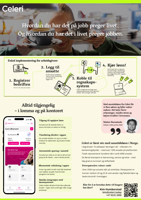 Celeri gir ansatte tilgang til opptjent lønn når de trenger det – uten å endre på lønnssystemet. Resultatet? Mindre stress, lavere fravær og mer stabile team.